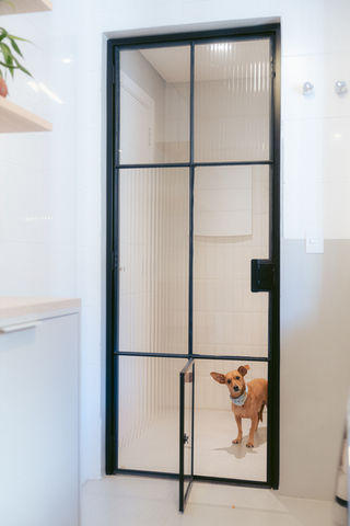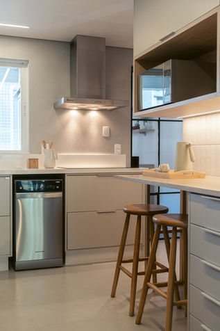Na cozinha, buscamos melhorar a funcionalidade e trazer mais aconchego para combinar com o restante da casa. No chão, trocamos o porcelanato com defeitos pelo piso de microcimento, também utilizado nas paredes sobre o revestimento existente. Os tons de areia e madeira na marcenaria combinados com a nova iluminação trouxeram o aconchego desejado. A portinha em serralheria que divide cozinha e lavanderia foi pensada especialmente para o Tito, facilitando o acesso para o banheiro.
