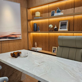 O cliente nos pediu um espaço acolhedor e sofisticado. Para isso, tiramos partido do piso de mármore existente e compusemos com a madeira.