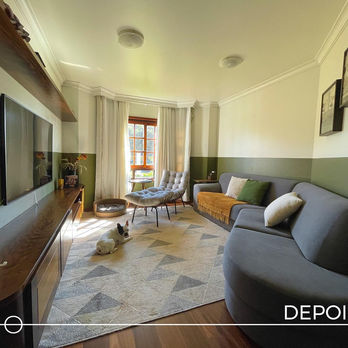 No lugar do sofá menor colocamos uma poltrona com puff para que ela possa esticar as pernas e relaxar ao lado de seu companheiro Eddie. O sofá com tecido gasto foi reestofado e nas paredes utilizamos a pintura em meia parede para dar sensação de mais amplitude no espaço.